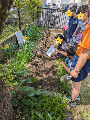 今月は、子ども友の会の基本の「ご飯炊きとみそ汁作り」。庭での作業は、「ジャガ芋植えとヘチマの種まき」をしました。昨年11月にみんなで蒔いたスナップエンドウ、鳥に芽を食べられて実がなるか心配しましたが、だんだん大きくなって花を咲かせ始めました。友の家の庭の一画の土を起こし、前もってTさんとご主人の協力で新しい土も入れていただいたところに、たね芋のジャガ芋を植えていきます。子どもたちは、Tさんの手描きの分かりやすい絵を見ながら、半分に切ったジャガ芋を等間隔で植えました。7月に収穫するのが楽しみです。温かい春の陽射しに誘われてか、昆虫の幼虫やアマガエルが姿を見せ(?)、子どもたちは喜んで触れ合っていました。