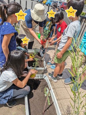 事前にスタッフで用意したプランターにミニトマトの苗を大事そうに植えていました。また庭の土を入れたところに二十日大根の種を、グリーンカーテン用のインゲンもみんなで1つずつポットに蒔きました。先月蒔いたヘチマはかわいい芽を出していました。来月、みんなで託児室前に植える予定です。また先月植えたジャガ芋は大きく葉を付けていて、みんな成長の速さにびっくりしていました。