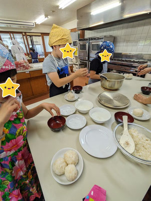 いよいよ次はおにぎりです。それぞれの班で、スタッフから握り方の手順を聞いて作っていきます。熱々のご飯をお椀に入れて、少し振り上げながら冷まします。手水をつけて塩を少し手にすり込んで握っていきます。それでもまだご飯が熱いようで、子どもたちは苦戦しながら握っていました。1つ握ったら重さを測ってみます。子どもたちの手では1つが90gよりは小さい程度。一人が2つ以上作りました。3つ4つと作った子もいました。食べきれるか…と心配しましたが、みんなしっかりおにぎりもみそ汁も(たくさんお代わりして)平らげました。ごちそうさまの後、みんなで協力して片付けをしさようならとなりました。