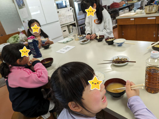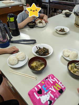 お腹もすっかり空いて、お待ちかねの「ご飯とみそ汁」の実食です。みんなで配膳をし、自分で食べられる量のご飯とみそ汁をよそい、食べました。おかずは、みそ汁の出汁を採るときに使った、昆布といりこのふりかけだけですが、みんなモリモリ食べておかわりもたくさんしてきれいに完食です。みんなで作って一緒にお話ししながら食べると本当に美味しいです。「美味しかった〜。お腹いっぱい〜。」とどの子も笑顔で帰っていきました。