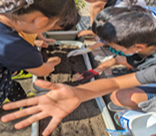子どもたちに堆肥のことを説明し実際に触って匂いも嗅いで体験してもらいました。