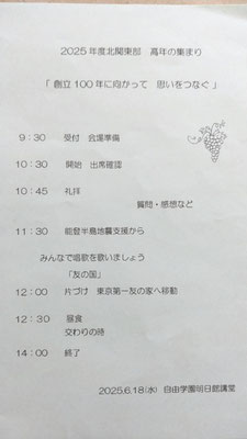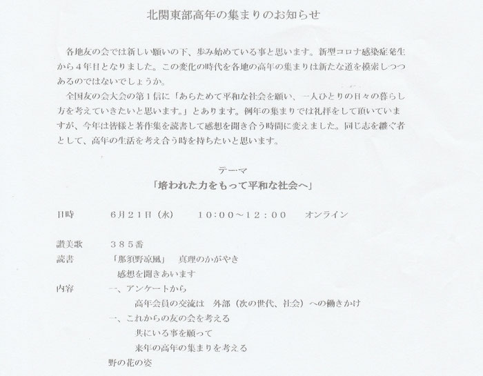 城山最寄の小板橋静子さんの手紙が 紹介 され ました。 こ の手紙 をいただいたとき 、その 内容や きれいな字を 見て、 102歳の小板橋さんすごいなーと感動し、刺激を受けました。私は友の一言や生活の様子に励まされ新しい一歩を踏み出せることが多々あります。小板橋さんの手紙もその一つになりました。 これからの高崎 友の会 高年の集まりも 、 それぞれの体の変化に寄り添って共につながりの中で声かけあって励んでいきたい。そう思う北関東部高年会員の集まりでした。(江木最寄 Mさん)