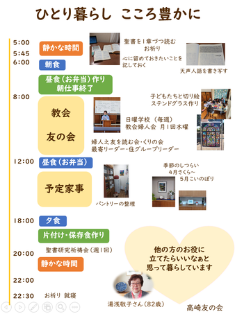 今年は集まることは無理かと思っていましたところ、オンラインでと99名の出席者の名前と内容のプリントを総リーダーさんから郵送されてきてびっくりしました。いつものようにYさんのお宅で参加させていただきました。各地の様子を伺うことが出来ましたが、一番心に残ったことは千葉キリスト教会の辻哲子先生の礼拝のお話でした。 老いを豊かに生きたい ① 友人を沢山持つ ②仕事以外に趣味を ③人のせいにしない ④前向きに考える とのお話は、現在の私の心に深く入りました。先生は、91歳になられたとの事を伺いさらにびっくりいた しました。現在、毎日あったことを書き留めておくとおっしゃいました。このことは私たちの使っている主婦日記も同じかなと思いました。友の会の食生活のおかげで86歳の私は元気で過ごさせていただいています。ありがとうございました。(安中最寄 Oさん)