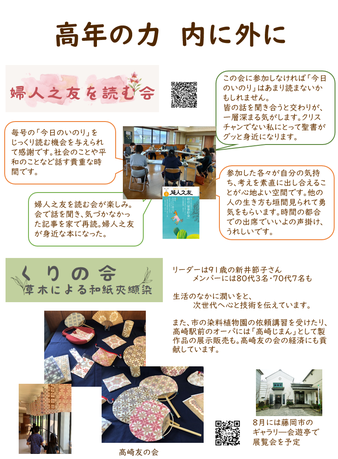 新緑のまぶしい季節になりました。各地の高年の集まりでは願いも新たに歩まれていることと思います。今年の北関東部高年の集まりは、創立者の志を受け継いで小さなものも差し出し、集め、愛あふれる社会をめざして活動されてきた皆さんの生活と技を集めて、どなたでも見ていただけるように展示「シニアの生活展」と、昼食付の従来の集まり「お食事と交わりの会」を開催、交わりを深くしていきたいと思います。
