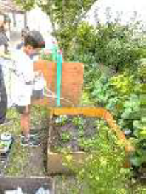 4 月に植えたじゃが芋は葉が勢いよく茂り、5 月に植えたトマトも花が咲き、小さな実が付き始めました。みんなで育っている様子を触ったりしながら観察します。5 月にポットに蒔いた落花生を鉄棒の隣の木枠の花壇に植え替えました。美味しい実がなるのが楽しみです。